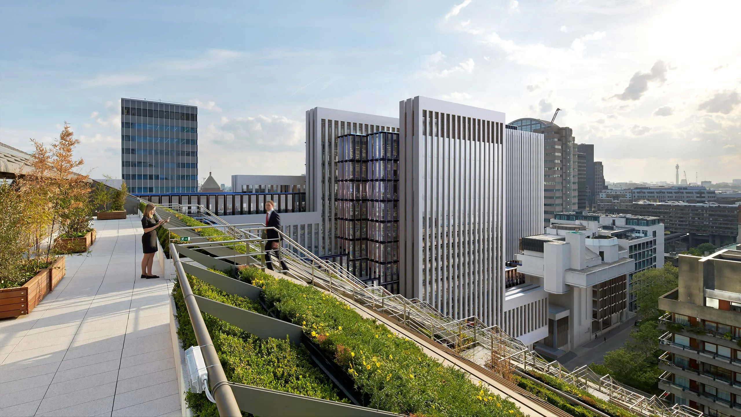 We used planters and our modular living wall system in a unique way to connect each terrace at the top of this building, right next to another project we worked on too: the beautiful London Wall Place.