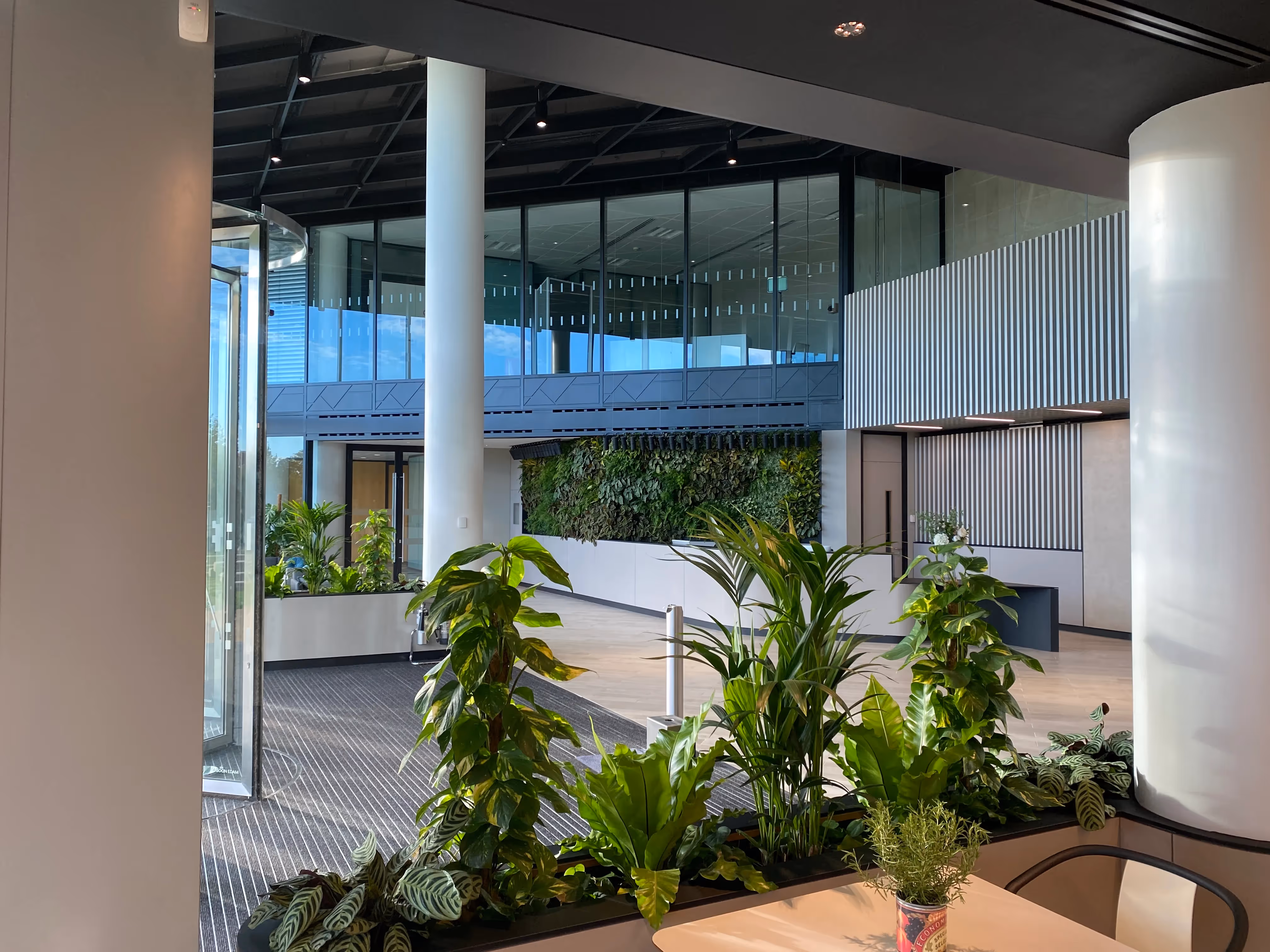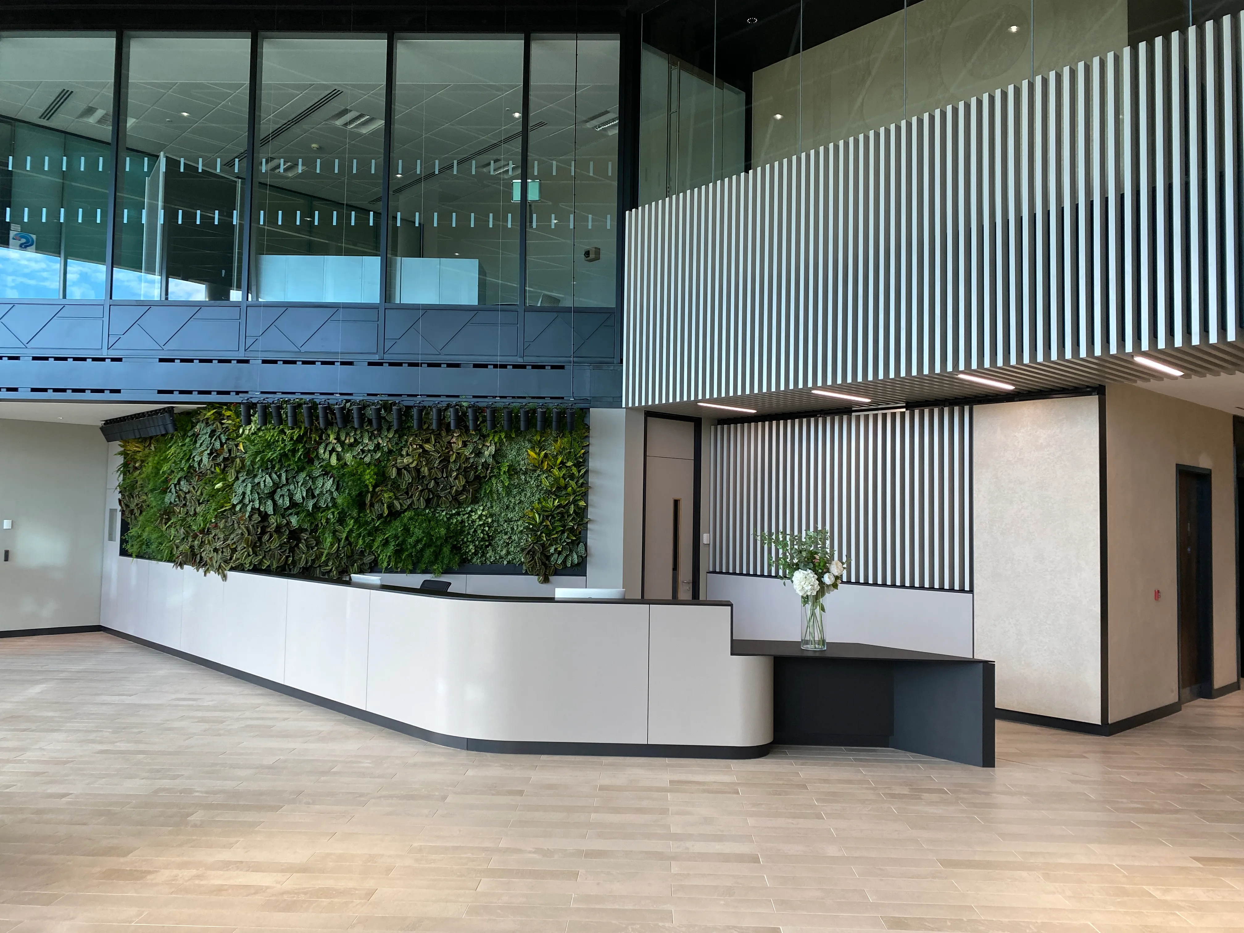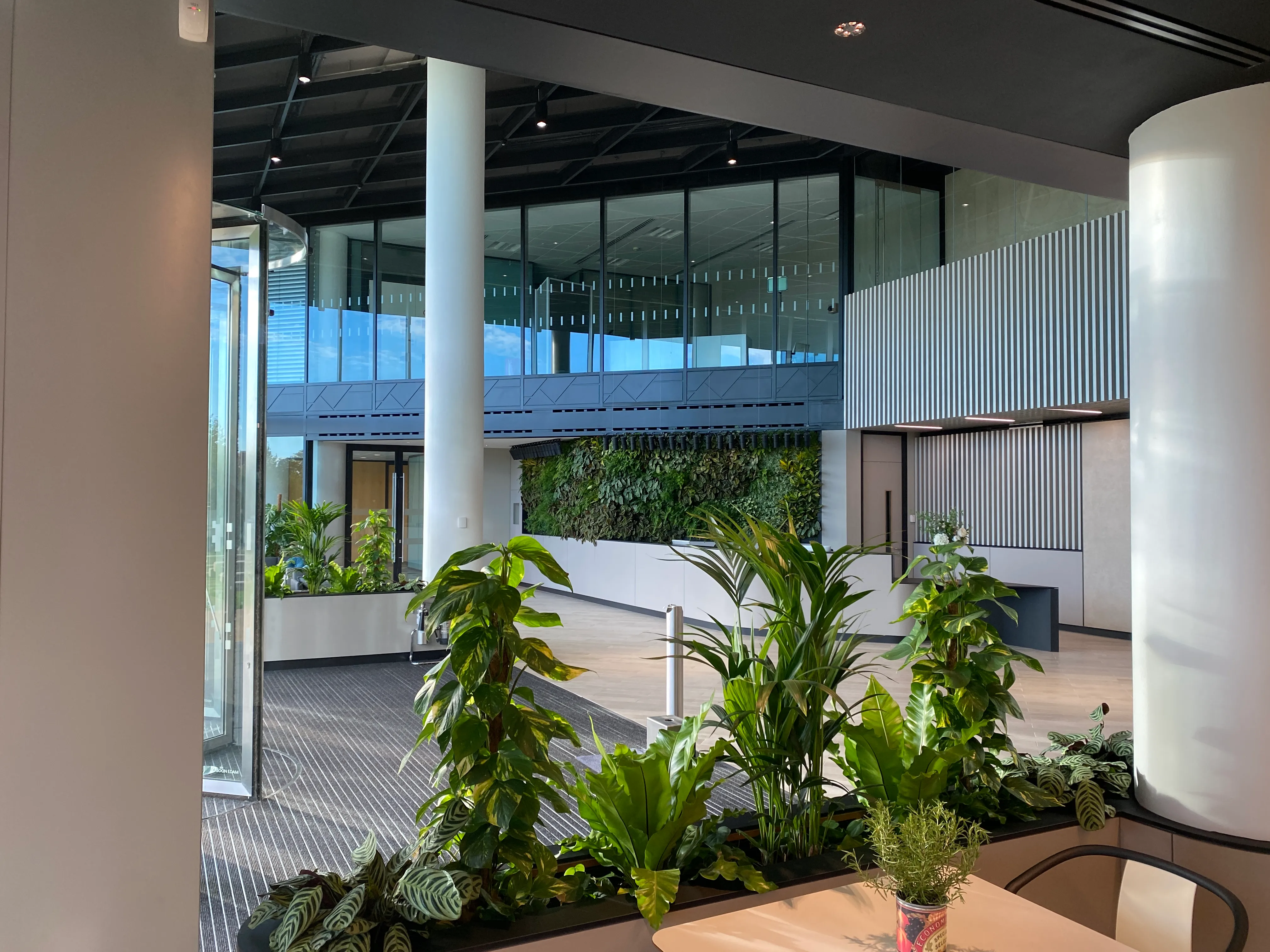 Winnersh Triangle is a business park in Reading and has recently been awarded both a Fitwel and GRESB accreditations for its wellbeing and sustainability programme across the park. Our work with the park involved both a living wall outside as an immediate welcome to the park, and one in the reception area inside along with planters.