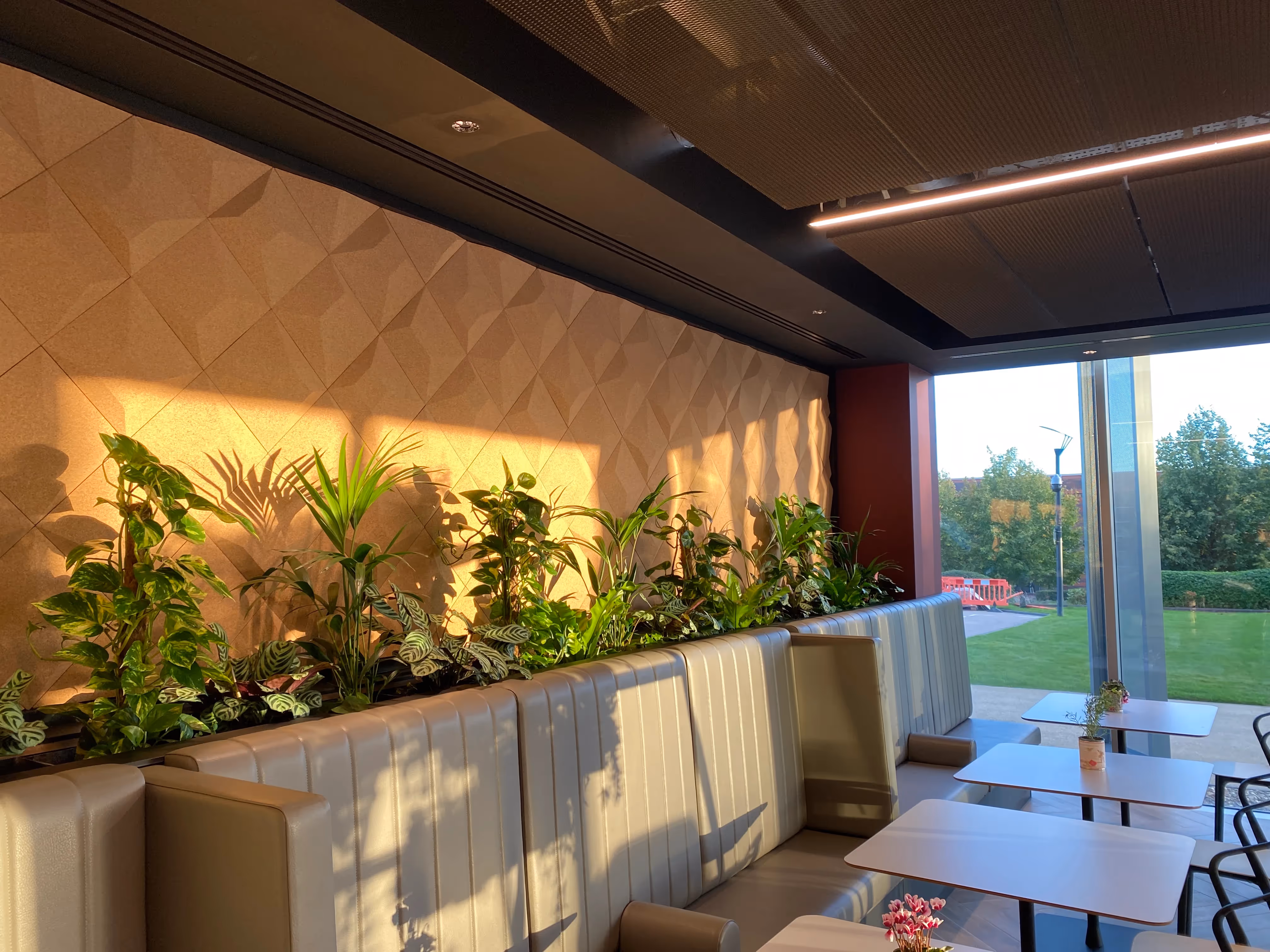The other part of our work on the site was inside. For this part (which we treated as a separate project) we worked with Scott Osborn Ltd, who specialise in high quality refurbishment works. This involved planters throughout the reception area, with some being used to create a partition between the main reception and seating area.