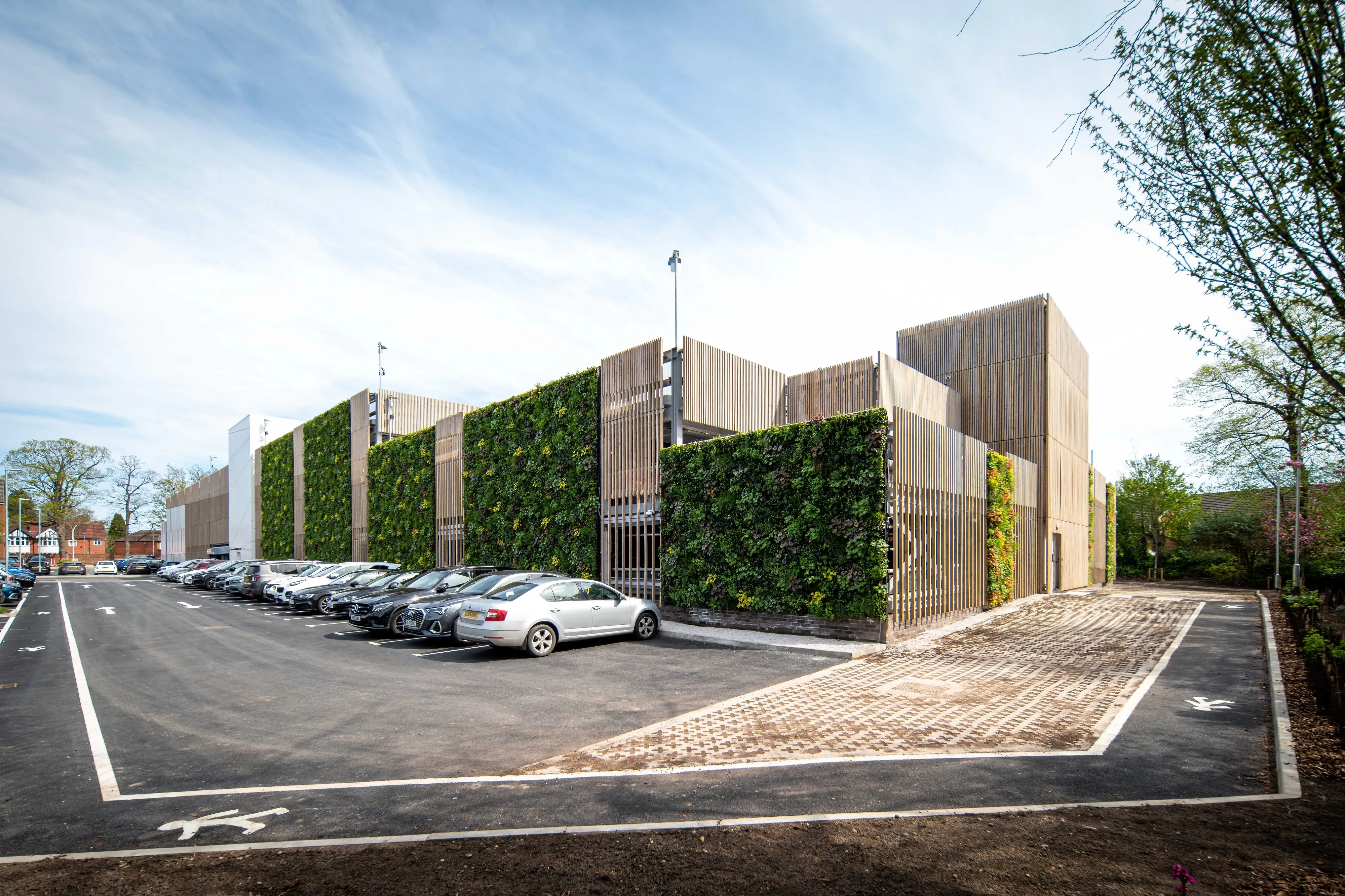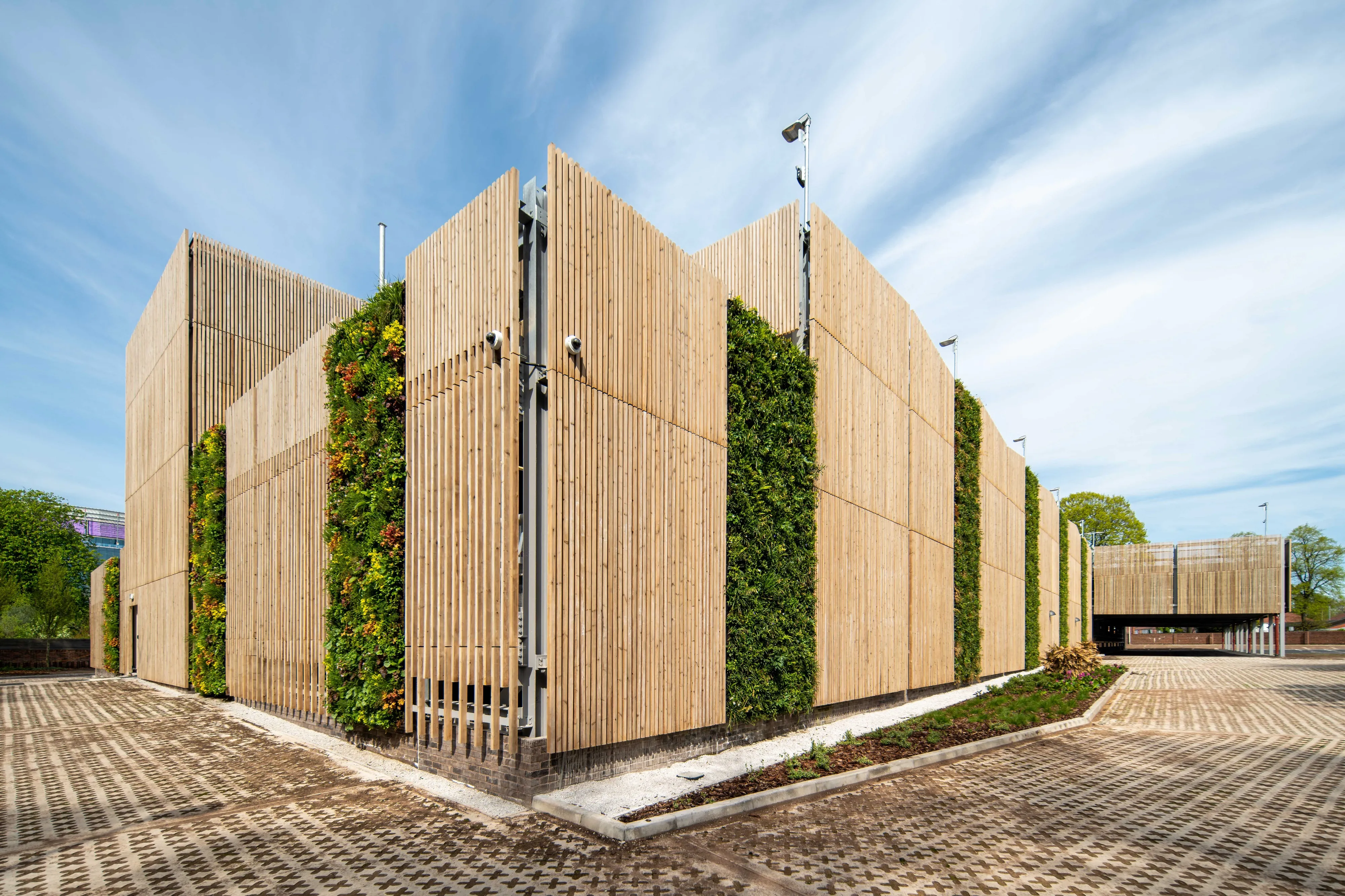 Over 40,000 plants were used on the 430m² car park façade, with the planted wall enhanced by vertical timber fins designed by Maple.